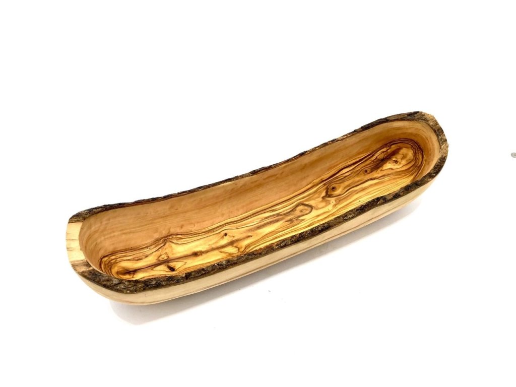 Rustikální olivová miska na chléb / pečivo (délka 35–39 cm) – přírodní design, univerzální použití jako servírovací miska či dekorace.